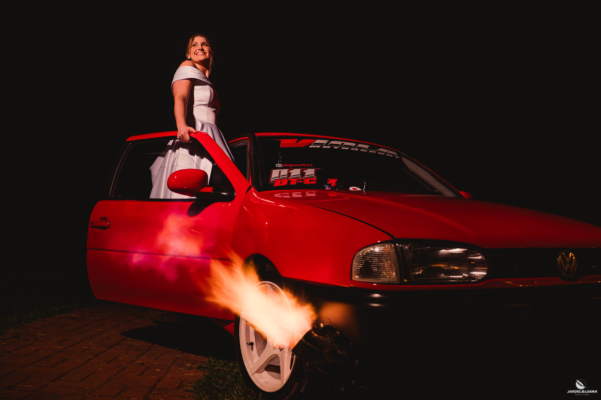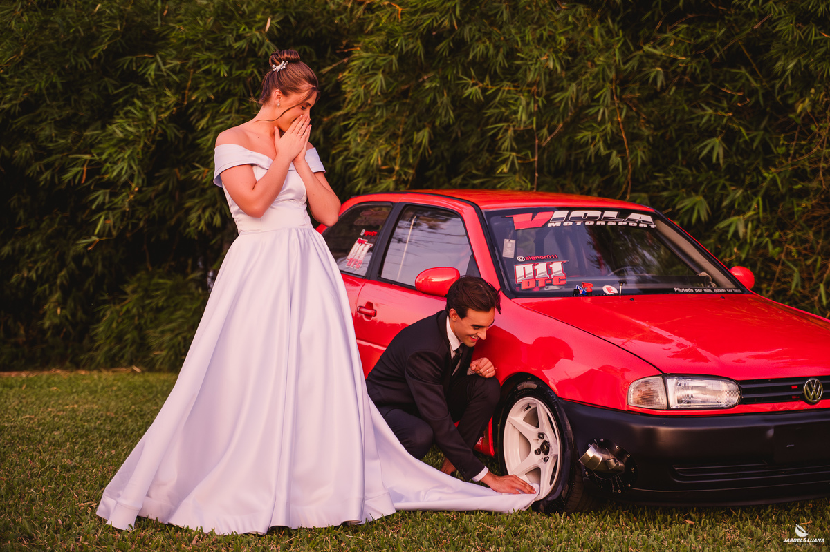 Samuel carrega uma grande paixão por carros velozes e pelas pistas. Seu Gol de corrida, que faz parte da sua história, também esteve presente nesse dia tão marcante. Entre risadas e momentos espontâneos, fizemos fotos que traduzem essa paixão, e o mais bonito é ver que a Sabrina também compartilha desse universo, mostrando que o amor deles também vive nas coisas que os unem.